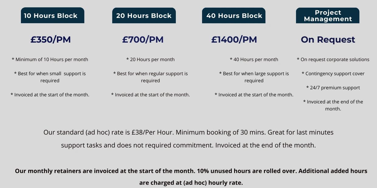 Our price packages are tailored for flexible and scalable support. We offer one-time assistance, hourly, or ongoing monthly support for a wide range of our administrative tasks and projects. We recommend using one of our tailored packages that best suit your business needs to ensure a secure number of hours each month, so to get the most out of the services we offer. Our packages are invoiced and paid at the start of the month to guarantee consistency in our services and partnership.